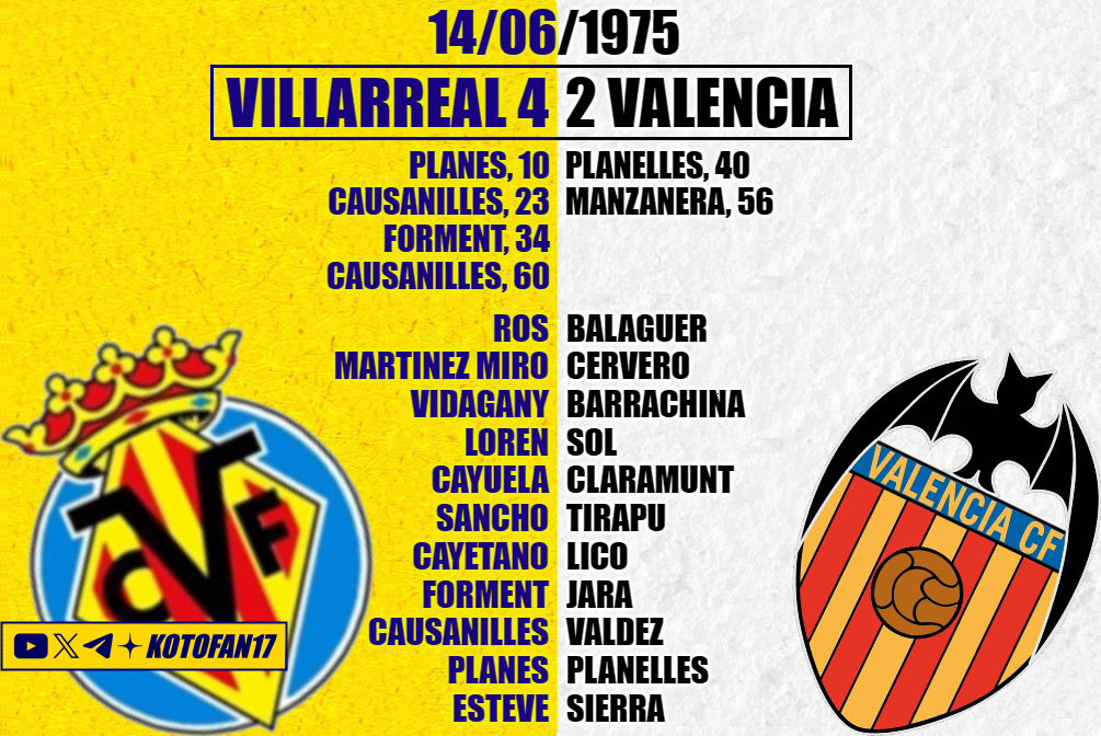 И вот 14 июня 1975 года – это тоже была суббота – с третьего раза вкус победы в дерби познали и Подводники. Кстати, если брать официальные матчи, то Вильярреал обыграл Валенсию (равно как и Барселону с Атлетико) с первой же попытки: это была огромная сенсация, когда в сезоне 1986-87 команда 4-го дивизиона выбила из Кубка Испании завсегдатая Примеры (ссылка будет ниже).